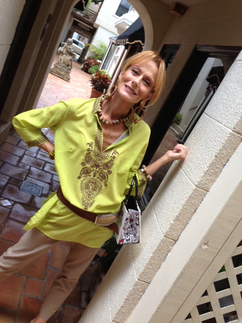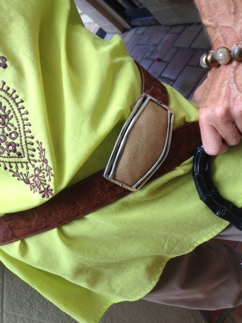 This one of a kind belt is made from distressed leather with a center made of sing-ray, designed by Connie Bates. It looks lovely belted over the lime silk tunic, with both shades of brown giving the outfit a unique stand-out look for summertime!