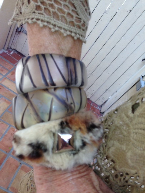 These one of a kind bracelets combine hand carved acrylic designs with beautiful natural colors. You can see the detail in the cotton lace jacket at the wrist, but it continues throughout the whole garment! Stop by 323 Worth Avenue, Palm Beach to see the collection or shop at any time online at www.bonnieroseman.com