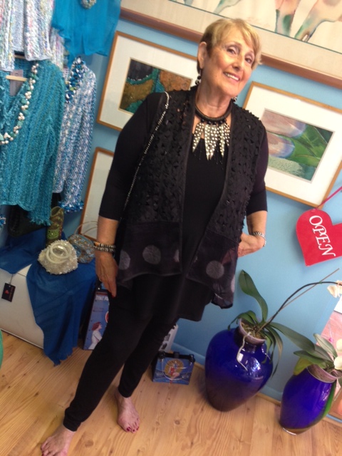 This gorgeous gal has also been “Bonniefied!” Bonnie Roseman dressed her in a one of a kind Japanese vest, and complimented the sultry black look with a necklace all the way from Morocco! Find treasures from all over the world at Bonnie Roseman’s BLT Boutique at 323 Worth Avenue, Palm Beach.