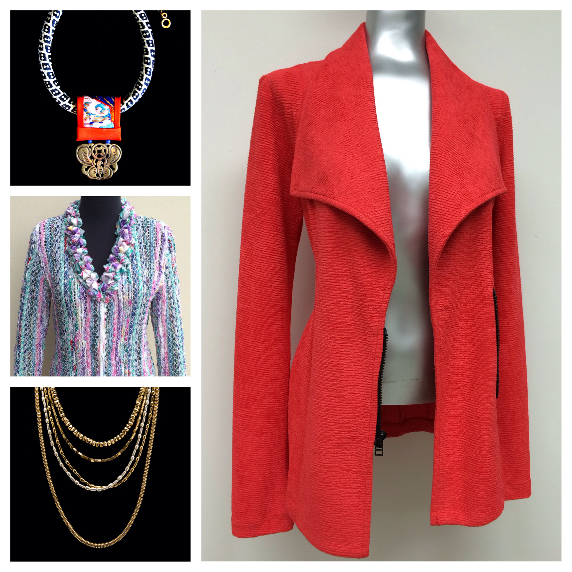 This bold red statement jacket can be worn year round. Add a beautiful neckpiece and the combo matches any neutral tones in your wardrobe. Bonnie likes to connect with her clients on a personal basis to assess their wardrobe needs based on their lifestyle. She can meet clients in person, and anywhere around the world using Facetime and Skype. Email Bonnie@bonnieroseman.com to get started today!