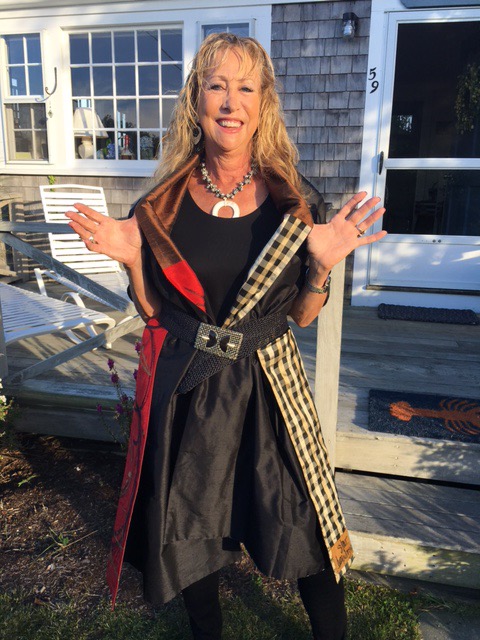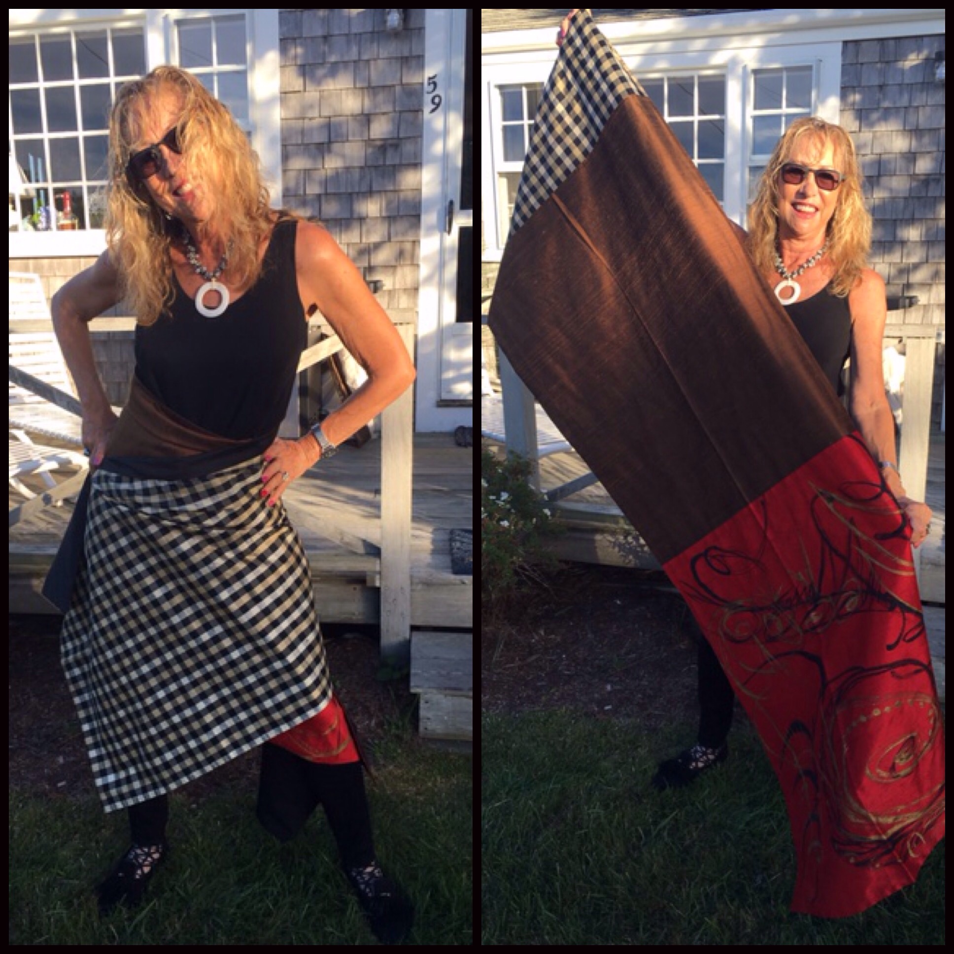 To demonstrate this principal, I have chosen a one of a kind silk shantung wrap. It is made with black and copper taffeta with hand-painted touches and a large gingham print.